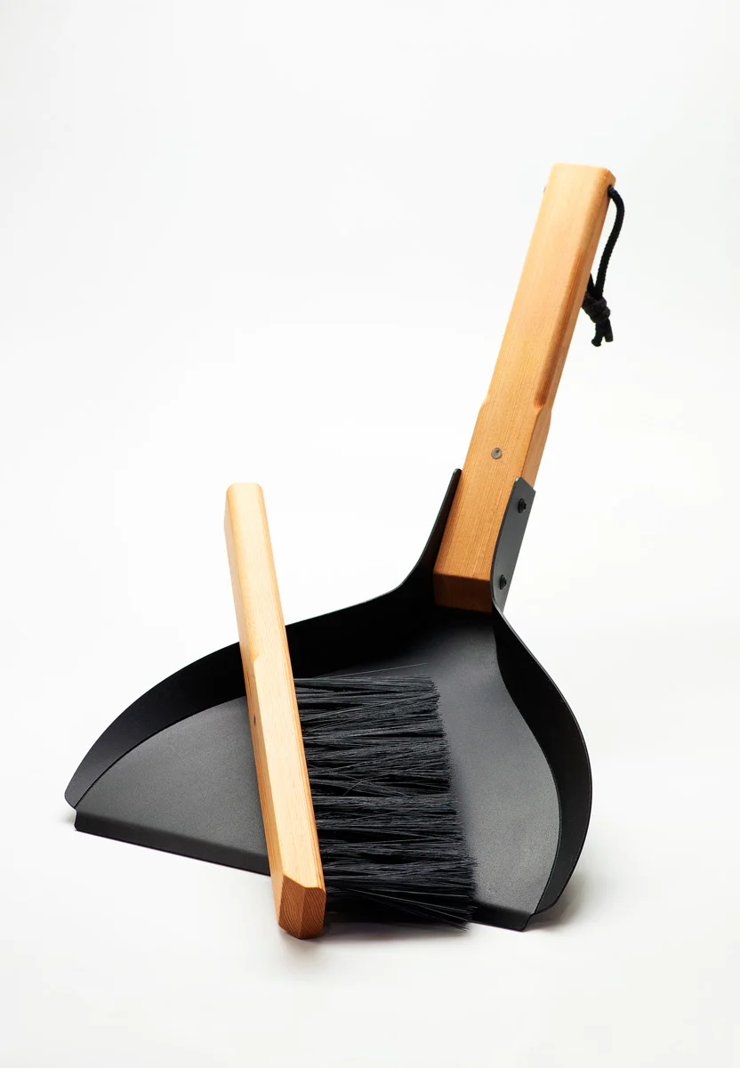 A dustpan and brush, made of cedar wood, PP bristles and aluminium.